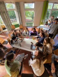 Am Nachmittag begann, in der Freiburger Jugendherberge, die Arbeit an den Themen der SMV für dieses Schuljahr. Die Erste Schülersprecherin Lara Nimmerfroh (10a) übergab das Wort an Marla Werr (9a) und Jon Buchmüller (J2), die von ihrem Aufenthalt in Barcelona berichteten. Wenige Wochen zuvor waren die beiden zusammen mit den beiden Spanischkursen der Jahrgangsstufe 2 und Schulleiterin Katja Kranich zu Besuch im Learnlife Center in Barcelona gewesen. „Learnlife“ ist eine Alternative für eine staatliche Schule. Das Besondere an Learnlife ist, dass Schülerinnen und Schüler vollständig an ihren Stärken orientiert lernen können. Zudem gibt es keine Klausuren und keine Noten, Lehrkräfte fungieren als Learning Guides bzw. Mentoren. Wichtig war es Werr und Buchmüller zu betonen, dass alle Schülerinnen und Schüler Freude am Lernen haben. Mit dem kurzen Impuls wollten sie dafür sensibilisieren, dass es bereits andere Modelle des Lernens gibt. Die drei Schülersprecher Lara Nimmerfroh, Emma Warga (beide 10a) und Batuhan Öztürk (8a) nahmen den Impuls zum Anlass zu motivieren, sich bei Schulentwicklungsprozessen als gesamte SMV einzubringen. Dabei werden sie auch von Schulleiterin Katja Kranich unterstützt.