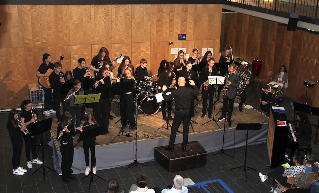 Nach einer kurzen Pause, in der das Publikum sich bei hervorragender Bewirtung durch die J1 über die Reiseerfahrungen austauschen konnte , betonte die von Thorsten Hohensee geleitete BigBand die laute und zum Feiern einladende Seite des Sommers mit „American Patrol“, das mit seinen fanfarenähnlichen Klängen für eine fröhliche Stimmung sorgte. Susanne Schips, Lehrerin für Französisch, Spanisch und Deutsch am Stromberg-Gymnasium, brachte mit ihrem Solo „Summertime“ von G. Gershwin nicht nur einen Hauch von Leichtigkeit in die Aula, sondern heizte diese durch den darauffolgenden und von der Big Band begleiteten Jazzstandard „Fever“ ordentlich ein. Die passende Hintergrundmusik für einen gemütlichen Strandspaziergang lieferten die zwei Solonummern der Schülerin Livia Kniep (9b), die das Publikum vor allem durch ihr selbst geschriebenes Lied „Je t’adore“ beeindruckte. Ein weiterer Soloblock war den Gitarren gewidmet. Eduard Holzäpfel (J2) spielte an der klassischen Gitarre – auswendig – das Präludium von J.S. Bach in E-Dur und auch Nikita Klymenko (8a) lud mit dem Solo auf der Westerngitarre zum vor sich hin Träumen ein. Die Big Band lieferte hier immer ein energiegeladenes Gegenstück zu den eher ruhigen Solostücken. Mit „Can’t stop the feeling“, „Take on me“ und „Seven Nation Army“ riss sie das Publikum aus den fernen Orten, in die die ruhigen Stücke geführt hatten, ins Hier und Jetzt und animierte zum Mitklatschen und Tanzen.