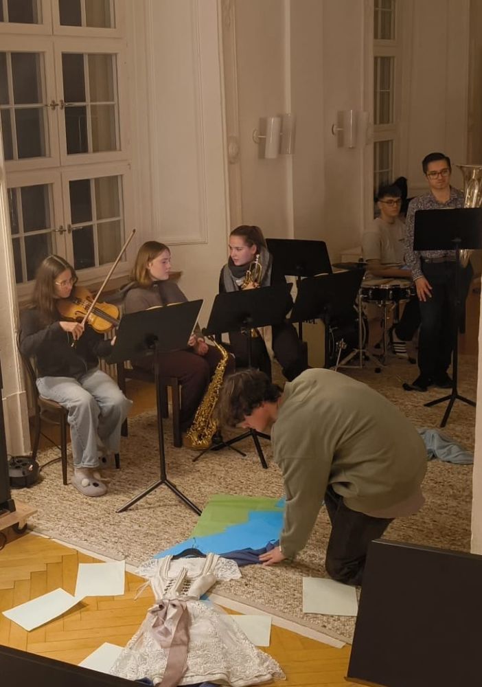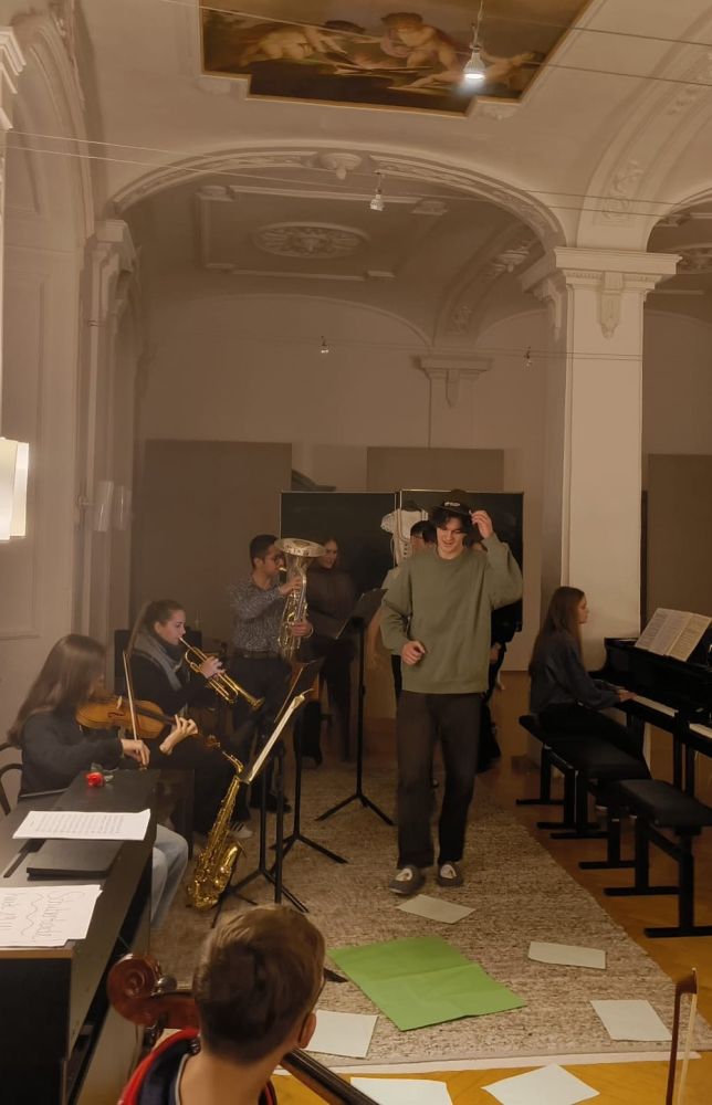 Während am ersten Abend gemeinsame Spiele im Akademiekeller das Rahmenprogramm bildeten, luden die Ensembles am zweiten Abend zum gegenseitigen Zuhören ein. Los ging es hierbei mit den Teilnehmenden des Leistungsfachs und ihrer eigenständig konzipierten „Schubertiade“. In kurseigener Besetzung wurden ausgewählte Lieder des Zyklus dargeboten, stets versehen mit neuen Ideen, mal gerappt, mal szenisch interpretiert und erläutert von Kursmitgliedern durch selbstgeschriebene Moderationstexte.