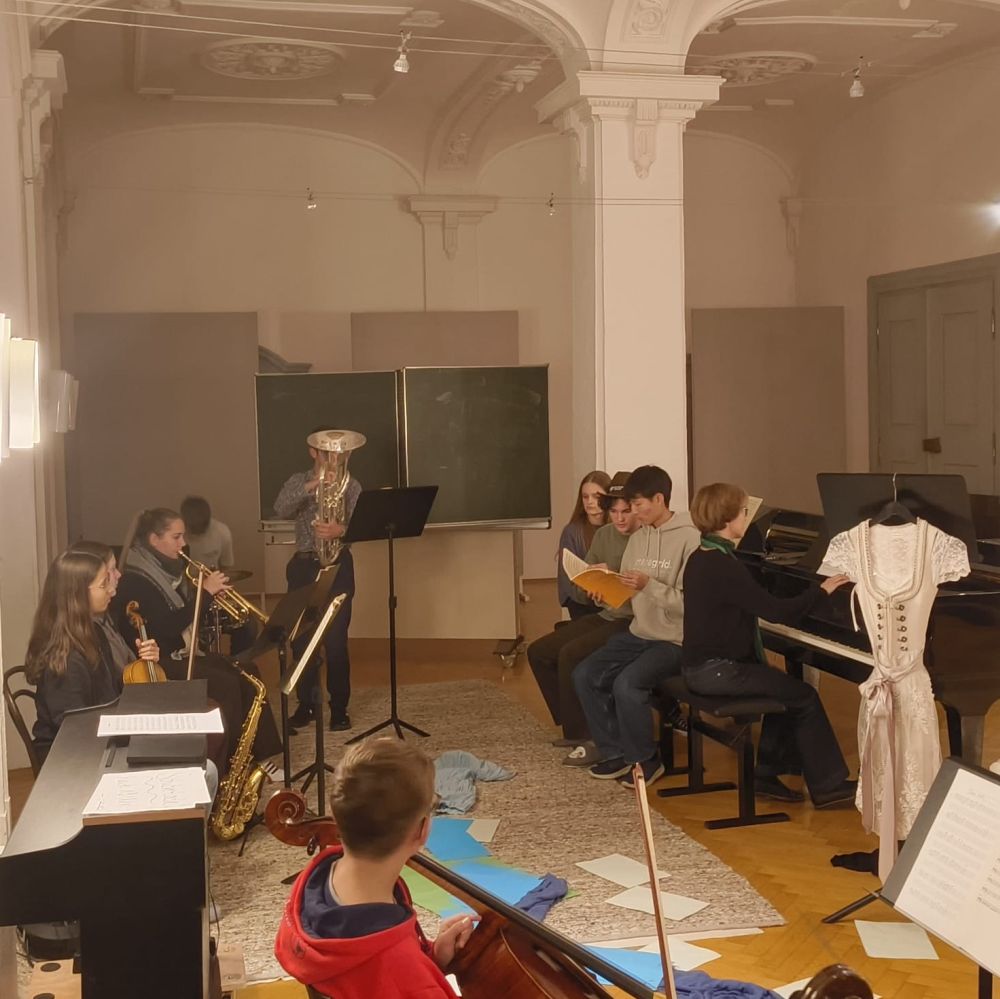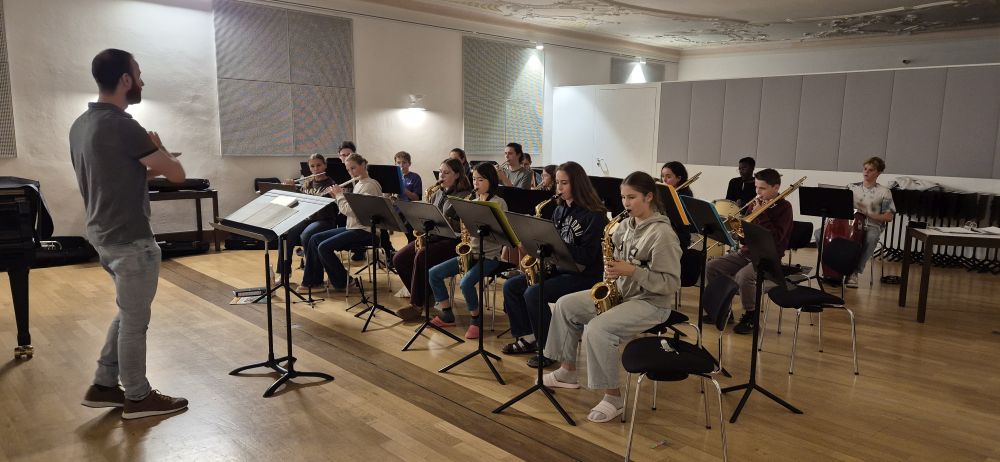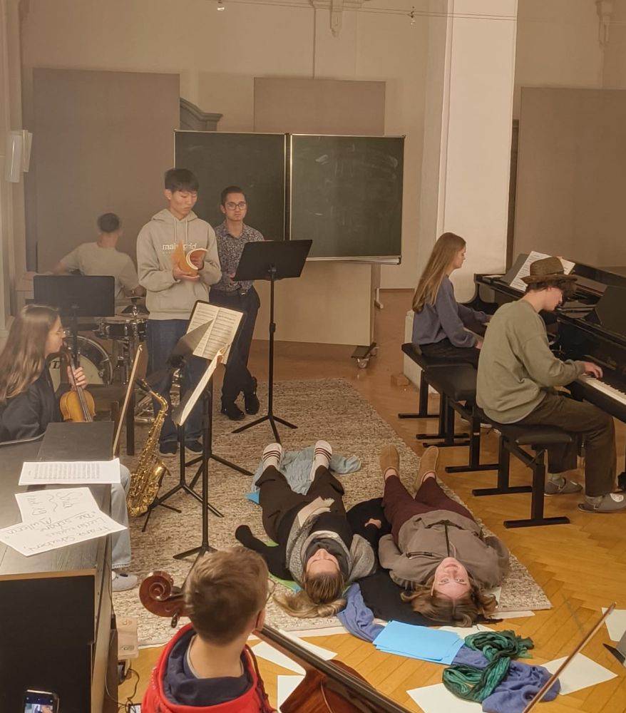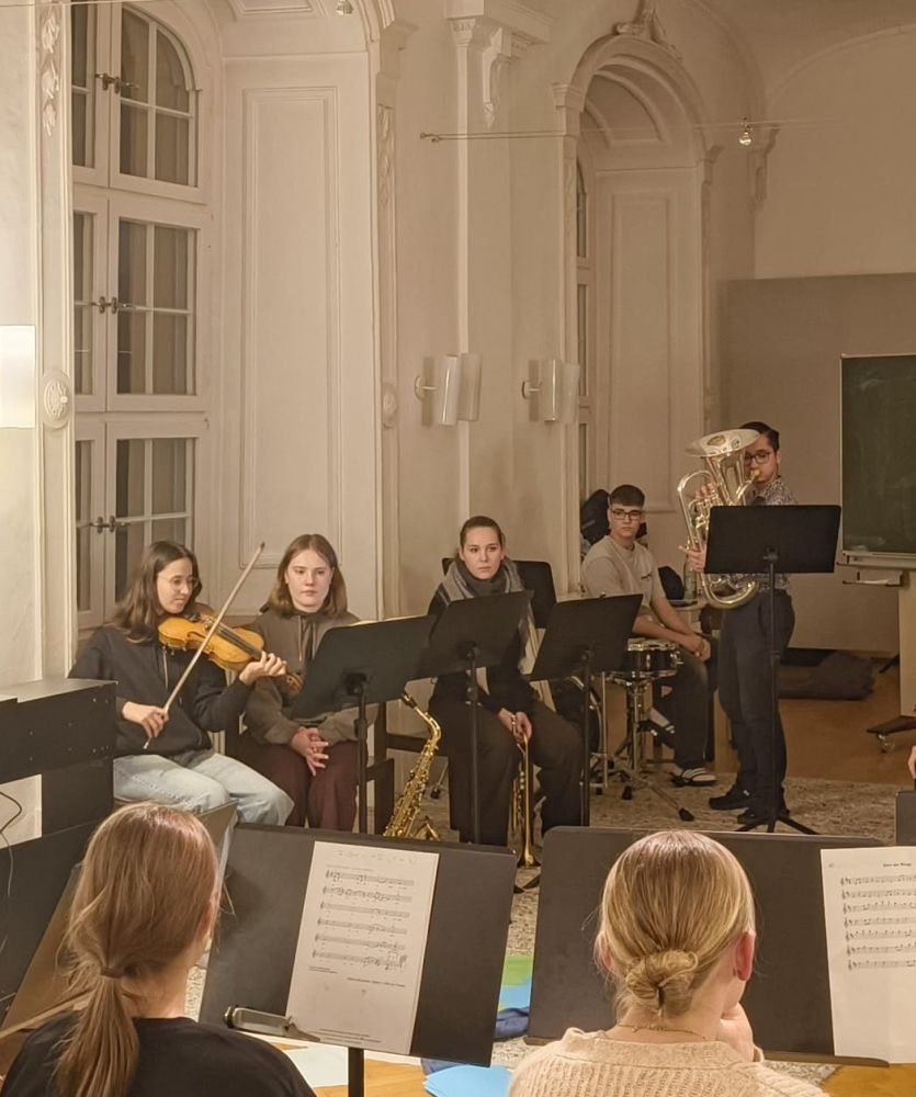 Bei den Proben bewiesen alle Schülerinnen und Schüler der beiden Ensembles sowie des Leistungsfachs, dass Musik und gemeinsame Ziele unabhängig von Alter und Klassenstufe verbinden und auch die Jüngsten aus Klasse 6 den Großen in Sachen Probendisziplin und Ausdauer in nichts nachstehen. Tapfer und mit viel Spielfreude behaupteten sie sich in langen und intensiven Proben, nach denen manche Stücke schon fast aufführungsreif erarbeitet waren.