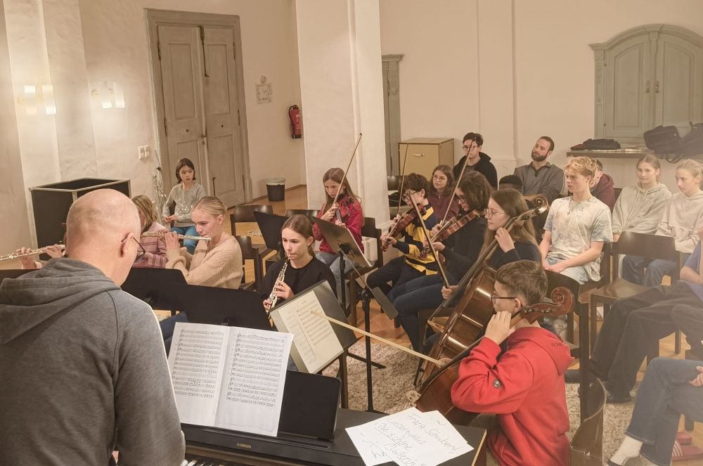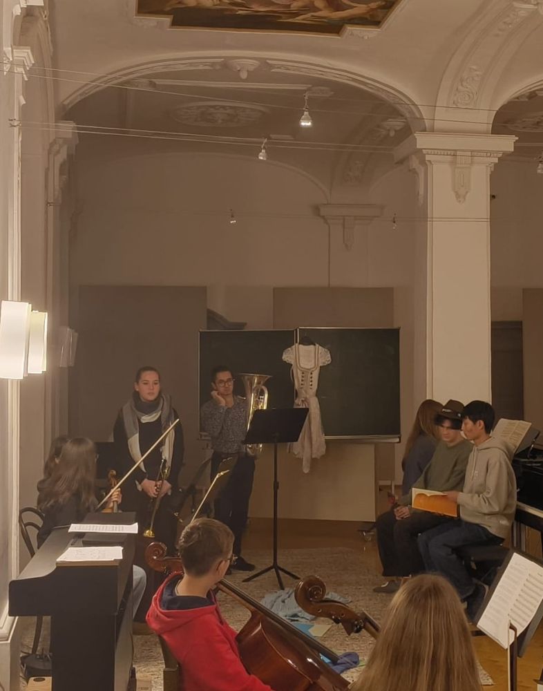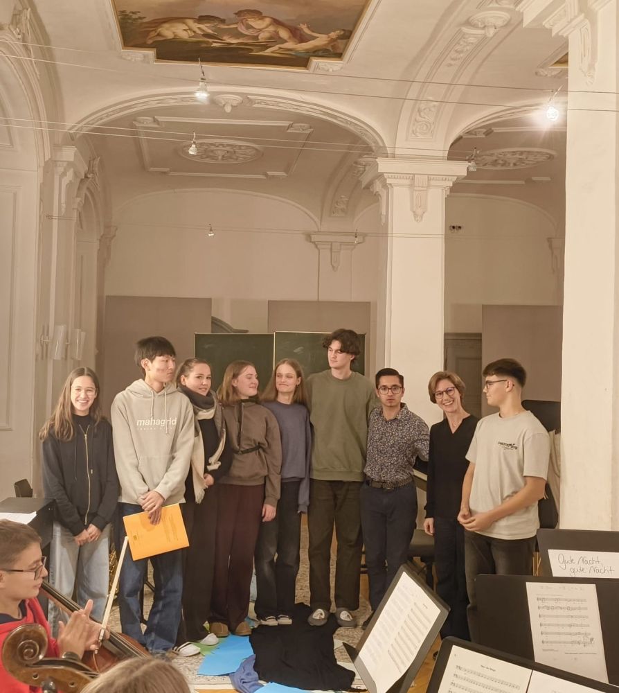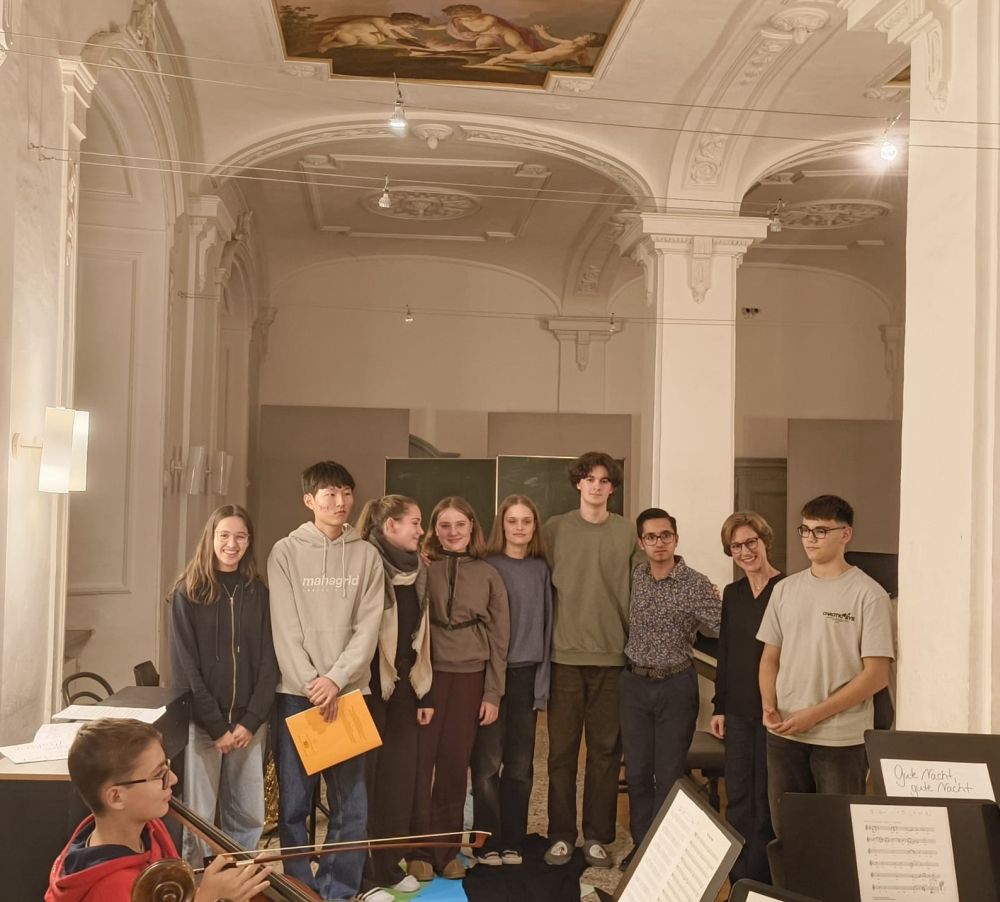 Auf dem Programm des Leistungsfaches mit Kurslehrerin Carmen Förnzler stand neben dem individuellen Üben für das anstehende Fachpraktische Abitur die eigene Umsetzung ihres Schwerpunktfeldes „Musik als Sprache“. Verpflichtender Kursinhalt ist hier neben Analyse und Interpretation des Liederzyklus „Die schöne Müllerin“ von Franz Schubert die kreative Auseinandersetzung mit den 20 romantischen Liedern für Klavier und Singstimme, die die unglückliche Liebe eines Müllergesellen beschreiben. Ziel und Höhepunkt ihrer persönlichen Ausgestaltung soll eine Aufführung in einer sogenannten „Schubertiade“ sein, einem Konzert unter Freunden und Interessierten – in den stimmungsvollen Räumen der Landesakademie fanden die Kursstufenschülerinnen und -schüler hierfür den idealen Ort.