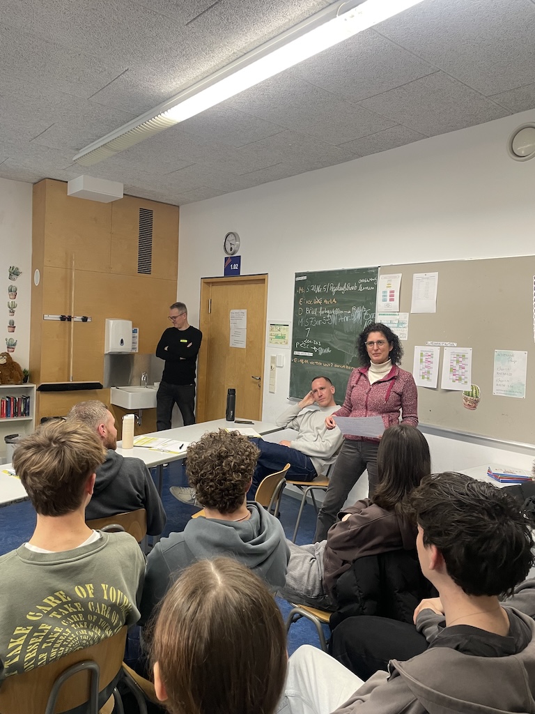 Entsprechend groß ist die Spannung um 14 Uhr bei den beiden Referenten sowie bei Schulleiterin Katja Kranich. „Der ‚Innovation Workshop & Pitch‘ fügt sich hervorragend in unsere Pädagogik am Stromberg-Gymnasium ein, da wir schon seit einigen Jahren den Fokus auf projektbasiertes Lernen richten“, findet sie. Auch Michael Hofer, Lehrer des Wirtschaft-Leistungsfachs in der Jahrgangsstufe 1, ist neugierig auf die Präsentationen. Er hat den Workshop ans Stromberg-Gymnasium geholt und auch die drei Jury-Mitglieder eingeladen: Zur Elternbeiratsvorsitzenden Maria Hölzel von der Firma Compounding Process Technology GmbH & Co. KG, die Unternehmen bei der Einführung neuer Produkte oder der Erweiterung ihrer Produktionskapazitäten berät, gesellt sich Johannes Lutz. Er ist Co-Gründer der Duschbrocken GmbH, die nachhaltige Pflegeprodukte ohne umweltschädliche Plastikverpackung herstellt und vertreibt. Pascal Hof macht das Jury-Trio komplett. Mit seiner Agentur Schillerhof GmbH berät und unterstützt er seine Kundschaft bei der Gestaltung ihrer Social-Media-Auftritte und der Content-Erstellung.