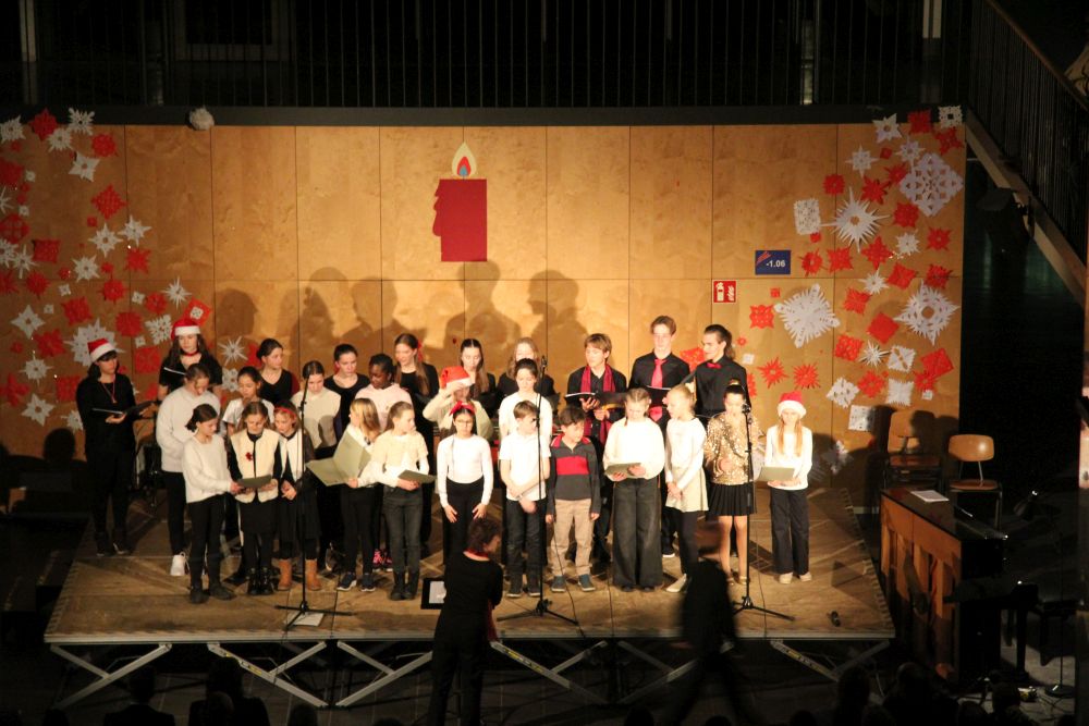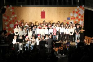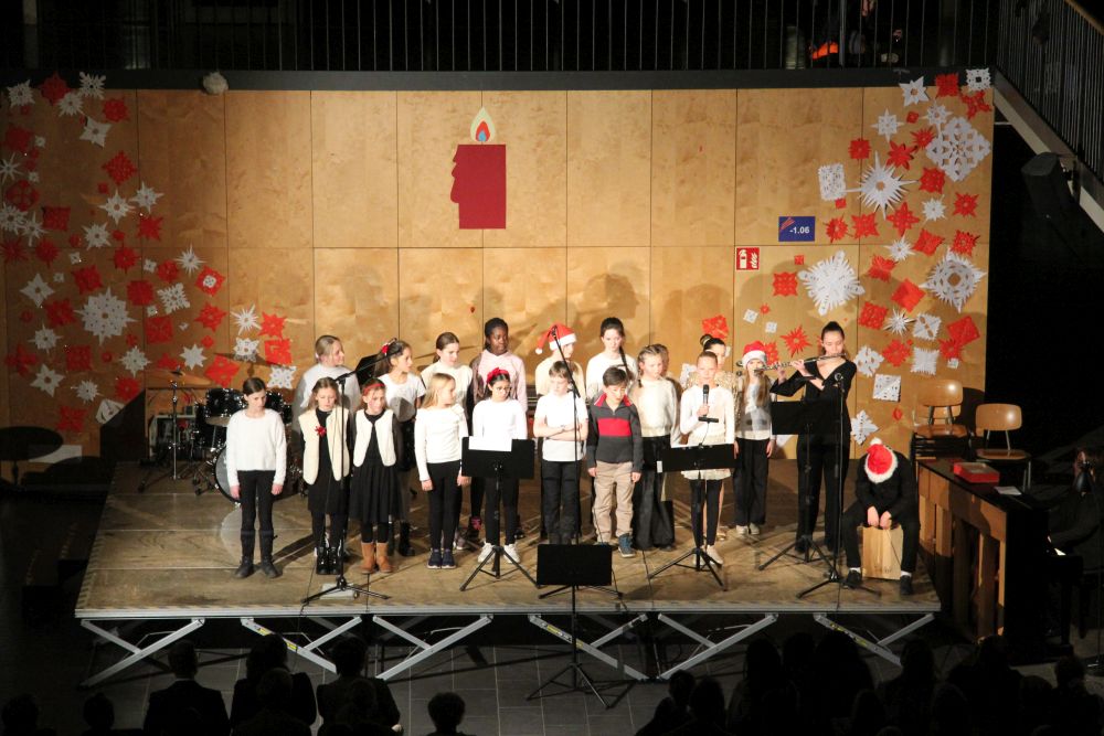 Mit traditionellem adventlichem Liedgut eröffnete auch der Singtreff der Klassenstufen 5 und 6 unter Leitung von Carmen Förnzler seinen Beitrag zum Programm: Indem auf das getragene „Maria durch ein Dornwald ging“ das fröhliche moderne Gospel „Down in Bethlehem“ folgte, zeigte der Chor seine Wandlungsfähigkeit, unterstützt von Hannah Binder (10b) an der Querflöte und Noah Bickel (6a) am Cajon. Choreographische Elemente rundeten die lebendige Darbietung ab. Stolze dreizehn der jungen Sängerinnen und Sänger wagten sich sogar mit kleinen Soloeinlagen vors Mikrophon, was das große Engagement und die Freude an der Darbietung bei den jungen Musizierenden unterstrich. Beim Kanon „Noël, Noël“ stimmte das Publikum beherzt ein. Nachdem somit alle gemeinsam den ersten Teil des Programms auf einem Höhepunkt hatten enden lassen, kam die kleine Stärkung, welche die Eltern der Klassenstufe 6 bereithielten, gerade recht.