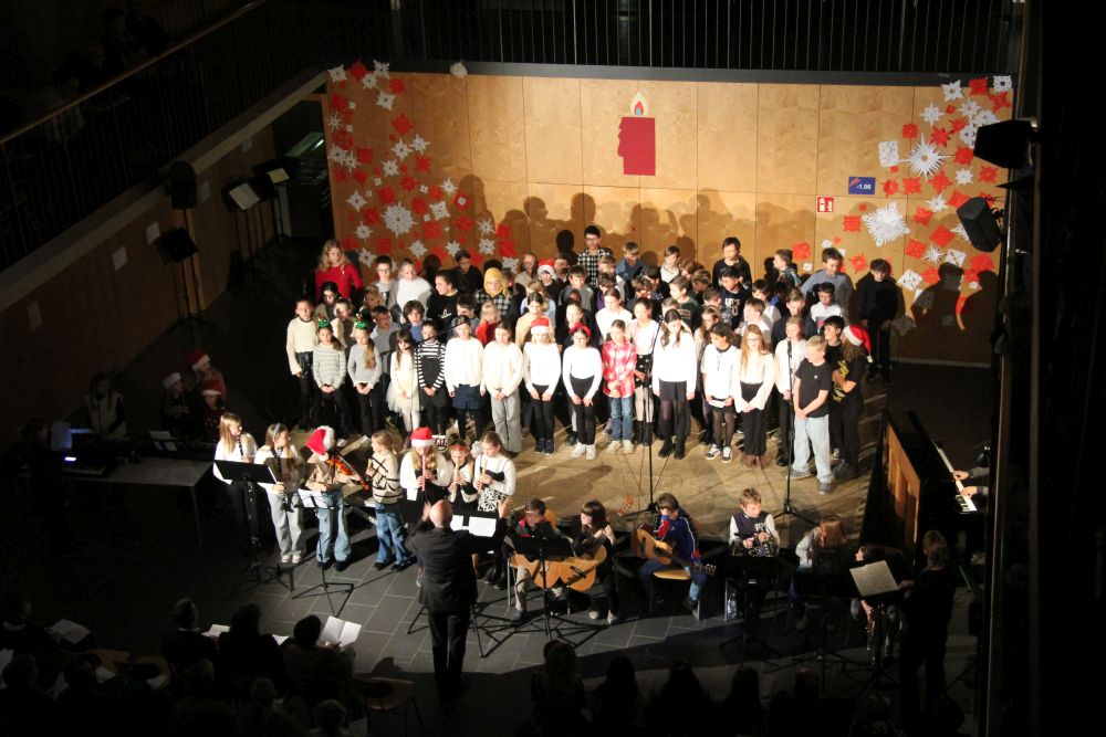 Das Orchester, dirigiert von Thorsten Hohensee, knüpfte mit den beiden traditionellen Adventsliedern „Wir sagen euch an den lieben Advent“ und „O komm, o komm, Immanuel“ nahtlos an die vorherige Darbietung an. Mit „Let it go“ aus „Frozen“ und „The Shire“ aus „Der Herr der Ringe“ präsentierten die Musizierenden aus unterschiedlichen Klassenstufen anschließend zwei Musicalmelodien und bewiesen damit eindrucksvoll die Vielseitigkeit ihres Repertoires.