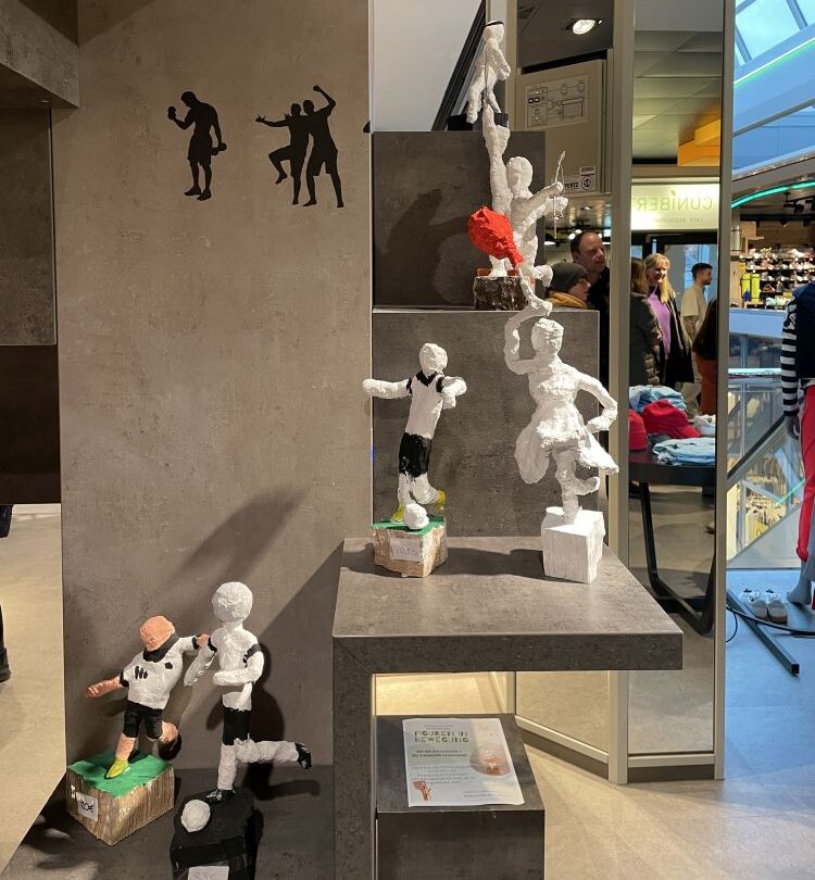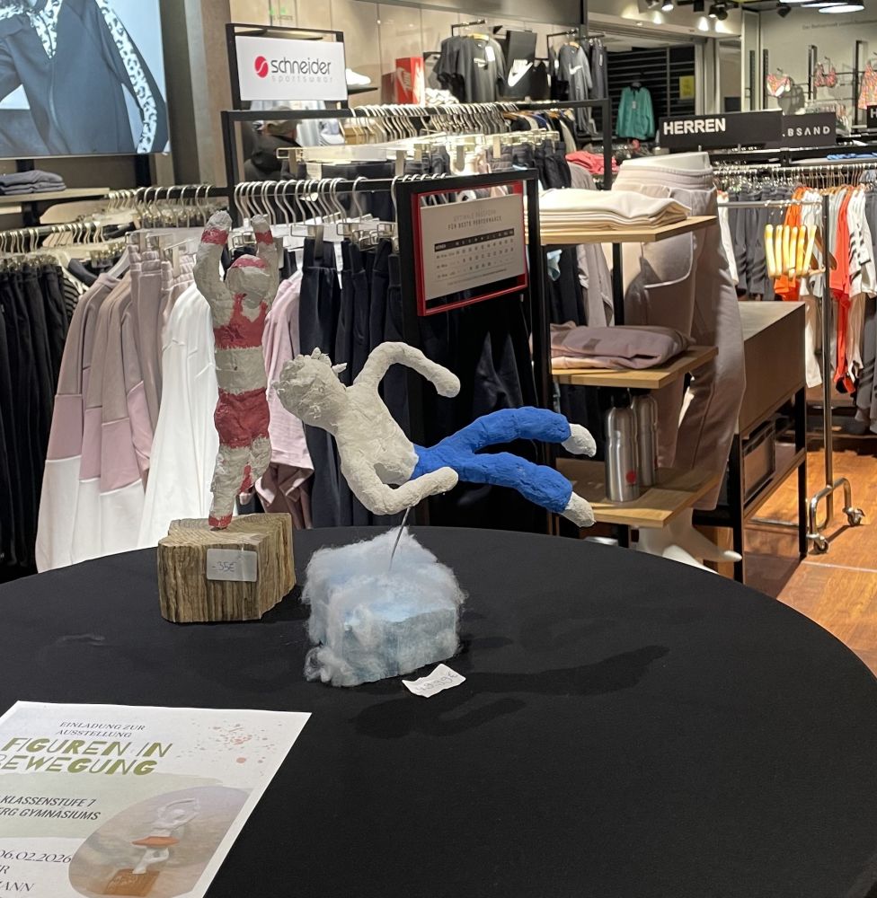 Der rechte Fuß des Fußballspielers steht fest auf dem Boden, während er mit dem linken ausholt, um den Ball abzuspielen. Eine Frau im Kleid, die frappierende Ähnlichkeit mit Mary Poppins hat, steht ebenfalls auf einem Bein, während sie einen roten Luftballon an einer Schnur festhält, der über ihrem Kopf schwebt. Ein Fallschirmspringer gleitet in Rückenlage auf ein Wolkenmeer zu, das bereit ist, ihn aufzufangen. Alle diese Figuren haben mehrere Gemeinsamkeiten: Sie sind in Bewegung. Sie sind nicht aus Fleisch und Blut, sondern aus Gips und Draht. Sie sind im Kunstunterricht der Klassenstufe sieben am Stromberg-Gymnasium entstanden. Und sie sind derzeit im Rahmen einer Ausstellung in der Sportabteilung des Vaihinger Kaufhauses Sämann zu bewundern – und teilweise sogar käuflich zu erwerben.