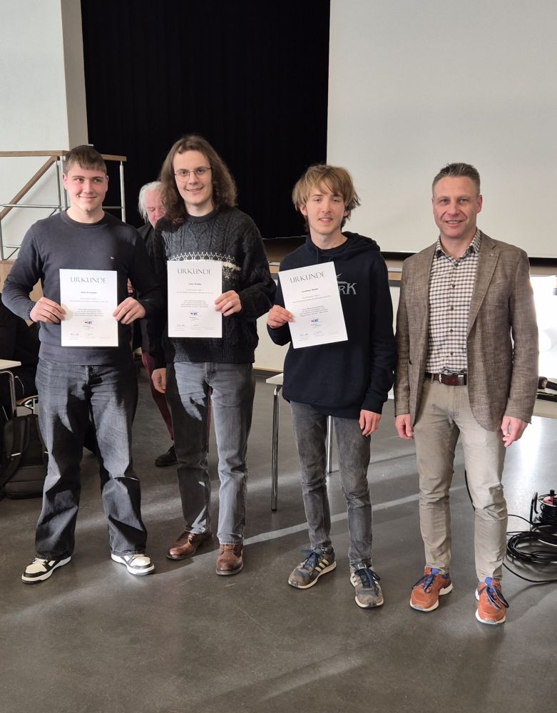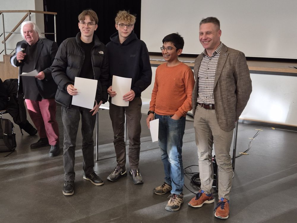 Nach einem Vortrag über die von Schülern des Rosenstein-Gymnasiums entwickelte Lernplattform „Right“ kam es dann zur mit Spannung erwarteten Siegerehrung der besten Teams. Unsere beiden Teams erreichten in einem starken Bewerberfeld hervorragende und leistungsstarke siebte und neunte Plätze. Den siebten Platz erzielten Mika Pfrommer, Linus Stubbe und Jonathan Rösler (alle J2). Den neunten Platz erreichten Mats Nienhaus und Urs Kneifel (beide J1).