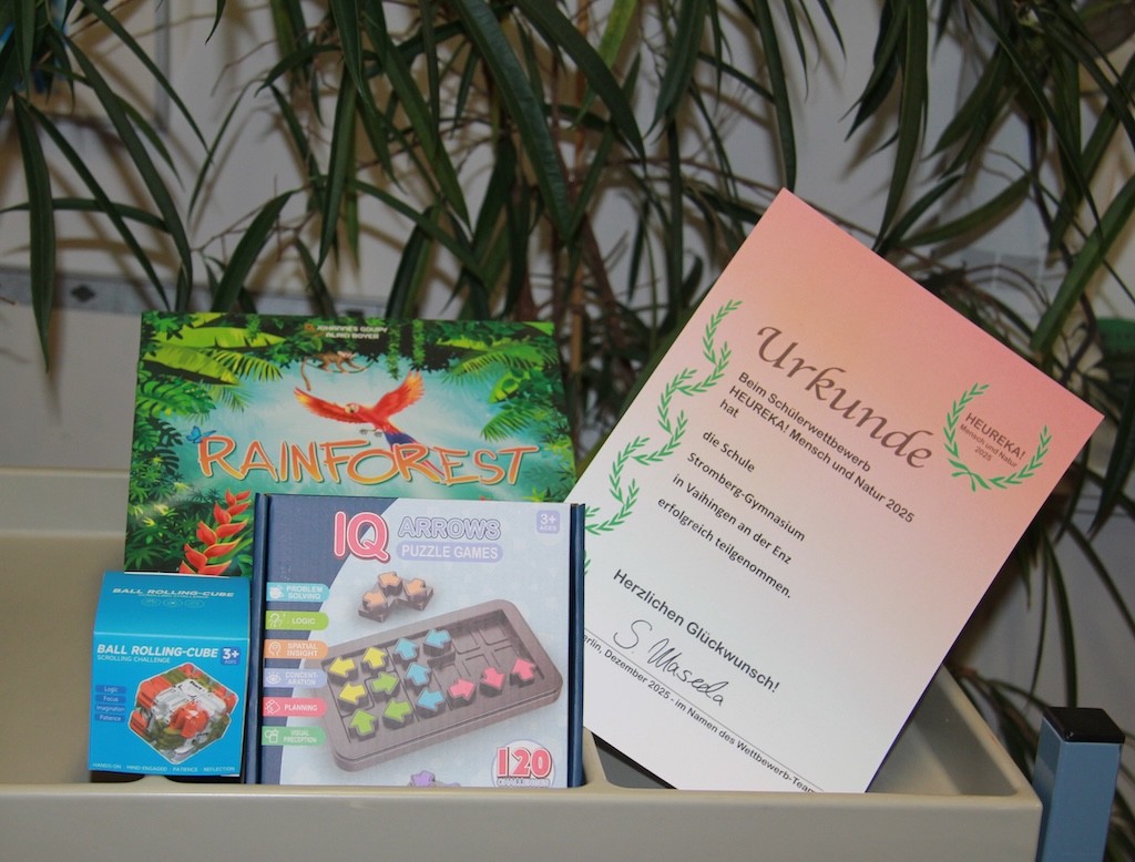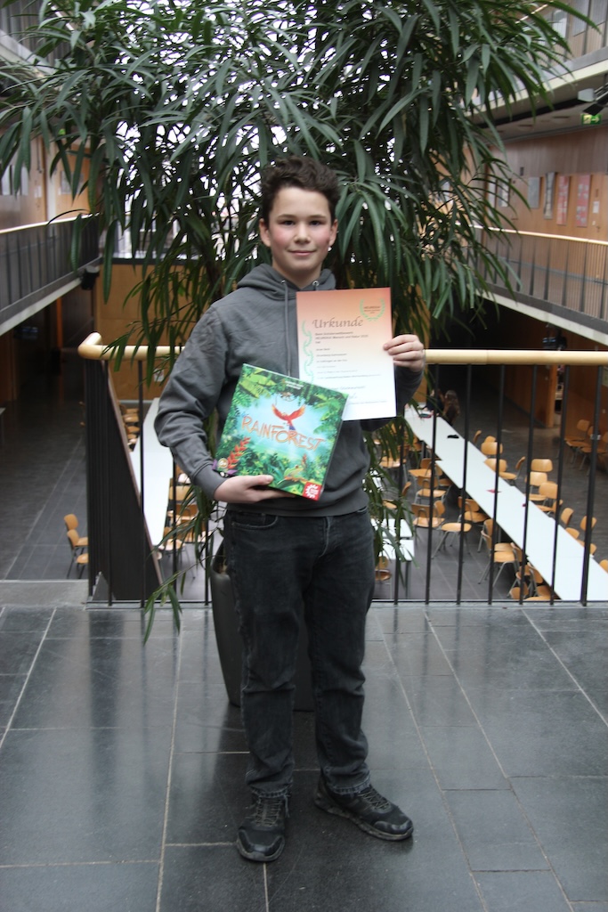 Am Heureka-Wettbewerb haben im letzten Herbst 79 Schülerinnen und Schüler aus den Klassenstufen 5 bis 8 teilgenommen. Der Heureka-Wettbewerb ist als Multiple-Choice-Wettbewerb konzipiert. Es werden Kenntnisse zu den Bereichen Natur, Pflanzen und Tiere, Wetter, physikalische und chemische Phänomene sowie Technik gefordert. Auch hier haben unsere Schülerinnen und Schüler wieder bemerkenswerte Ergebnisse erzielt. Einen dritten Preis auf Landesebene erreichte Arian Beck (8c) und bekam als Preis das Gesellschaftspiel „Rainforest“. Erste Schulsieger wurden Henrik Hoyer (5b), Roland Graner (6d), Lionessa Oberst (7b), und Nike Krilla (8b). Zweite Preise erhielten Liam Sartorius (5d), Emily Marie Plonka (6c), Marlene Gartmann (7b), Leandra Oberst (7b) sowie Diego Jordan (8b). Dritte Schulpreise erhielten Fynnian Knötzele (5b), Phillipp Ross (5d), Lena Simon (5c), Christoph Serafin (6d), Joel Zedler (6b), Stella Gerbig (6b), Julia Boxermann (7b) und Leonie Alber (8b).