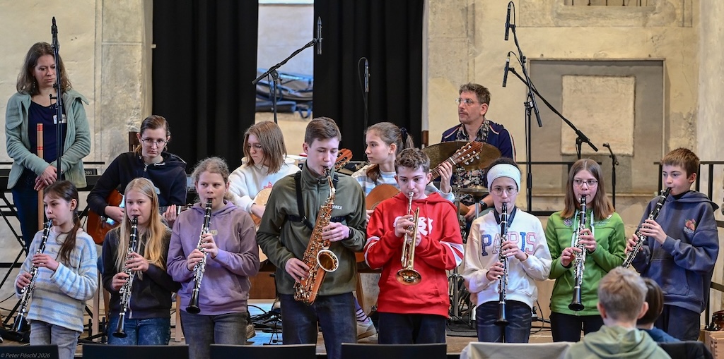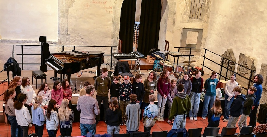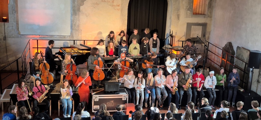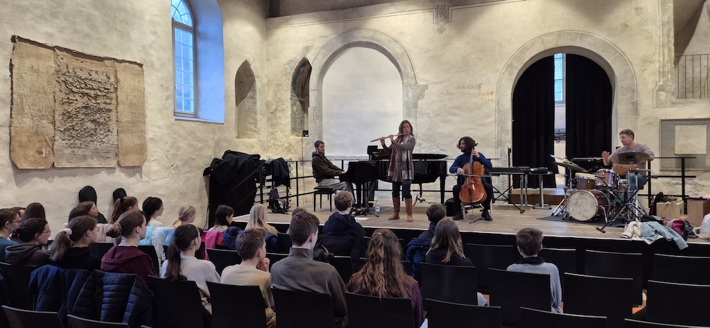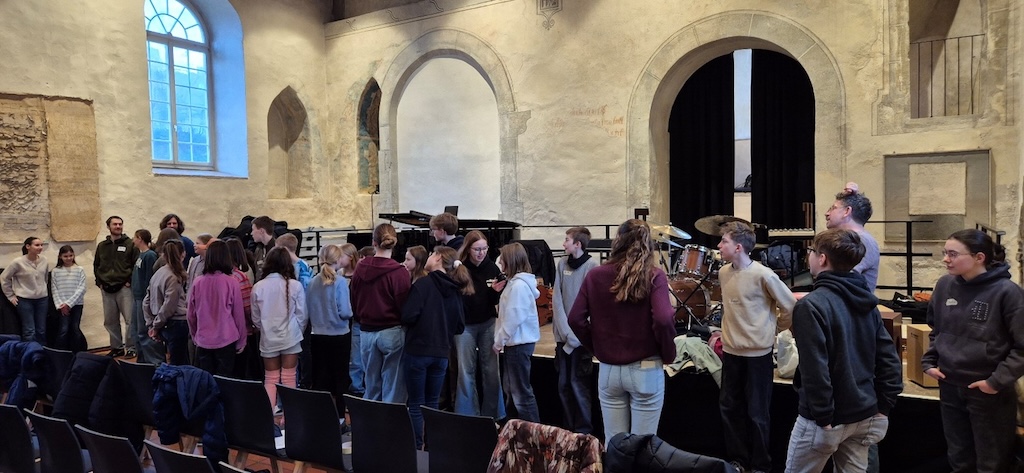 „Open your ears – you can fly!“ – unter diesem Motto trafen sich knapp 30 musikbegeisterte Schülerinnen und Schüler aus den Klassenstufen 6 bis J1 der beiden Vaihinger Gymnasien Ende Februar in der Vaihinger Peterskirche, um unter der künstlerischen Leitung des Soundrise Quartets Improvisationserfahrungen auf ihrem jeweiligen Instrument zu sammeln.