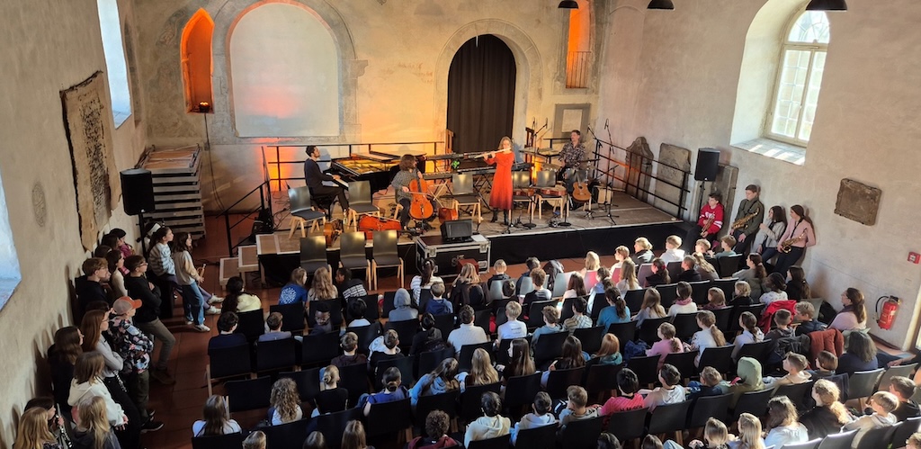 In einem stimmigen Wechsel zwischen Tutti-Phasen und dem Arbeiten in instrumenten- und altersgeteilten Gruppen, wo neben der Vaihinger Peterskirche auch Räume der Jugendmusikschule Vaihingen an der Enz mitbenutzt werden durften, vergingen die beiden Workshop-Vormittage buchstäblich wie im Flug. Den ersten Höhepunkt bildete dann ein Schülerkonzert vor vollem Publikum gegen Ende des zweiten Workshoptages: Vor einer vollbesetzten Peterskirche durften die sechsten Klassen beider Schulen im Rahmen ihres Musikunterrichts ein einstündiges Kooperationskonzert miterleben, das abwechselnd das Soundrise Quartet alleine sowie (bei einem Großteil des Programms) auch die Workhopteilnehmenden mitgestalteten. Das Publikum selbst war ebenfalls zum Mitmachen eingeladen und die Vaihinger Sechstklässlerinnen und Sechstklässler klatschten und schnipsten bestens aufgelegt im eigentlich eher ungewohnten 5/4-Takt – Musik vereint und macht gute Laune!