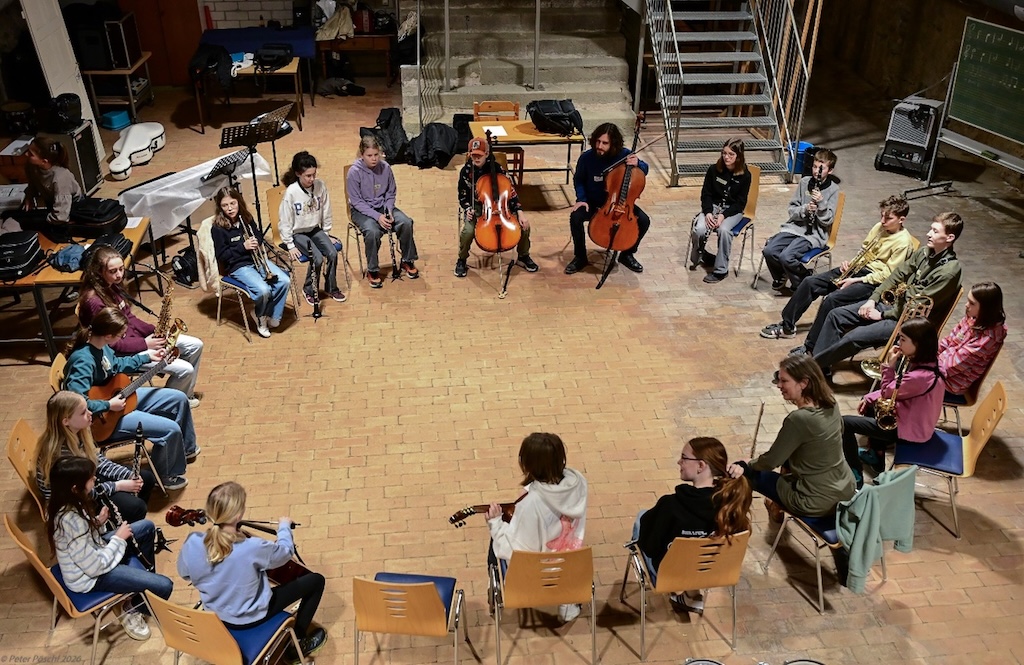 Ein spannendes Unterfangen, das allen Beteiligten zunächst zweierlei abverlangte: die Fähigkeit zuzuhören und den Mut, Neues zu wagen. Dass alle Teilnehmenden diese beiden Voraussetzungen mitgebracht hatten, davon konnten sich die vier leitenden Quartettmitglieder rasch selbst überzeugen. Denn egal ob die jungen Vaihinger Musikerinnen und Musiker das erste Mal überhaupt ohne Noten spielten oder bereits zuvor auf ihrem Instrument improvisiert hatten: die ganze Gruppe einte eine große Offenheit und Neugier in Bezug auf diese beiden ganz außergewöhnlichen Schultage.