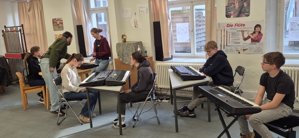 Mit bildreicher Sprache und hilfreichen Tipps auch aus dem (in diesem Kontext ganz und gar nicht trockenen) Bereich der Musiktheorie animierten die vier Leitenden die Schülerinnen und Schüler zu eigenem Ausprobieren von neuen, unerhörten Klängen. Mit großem Erfolg, was die durchweg hohe Konzentration, das anhaltende Interesse und auch die gute und wertschätzende Gesamtstimmung unter den Workshopteilnehmenden bewies, die sich großteils zuvor noch nie begegnet waren.